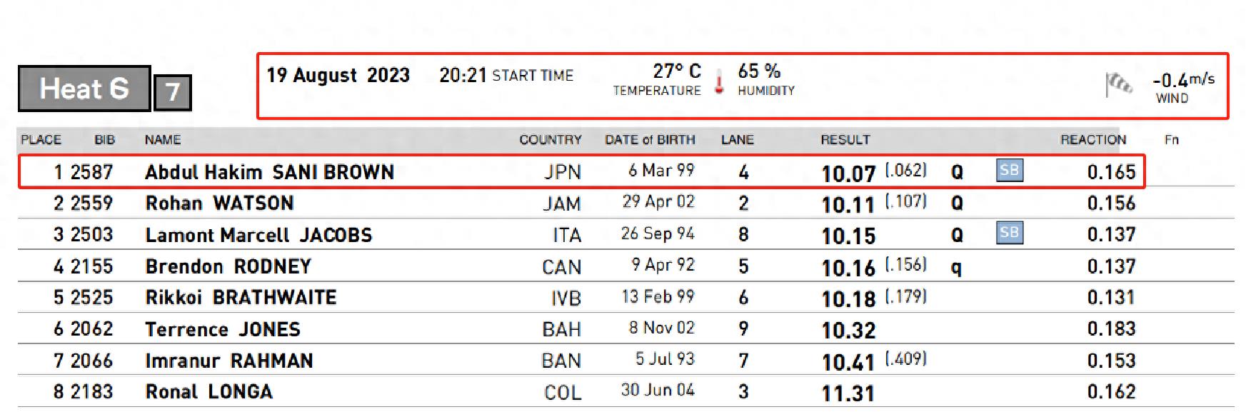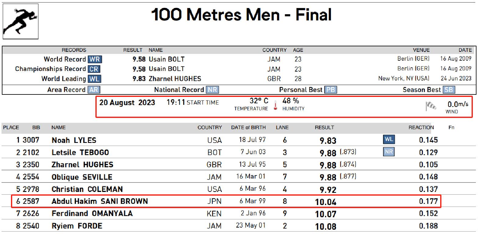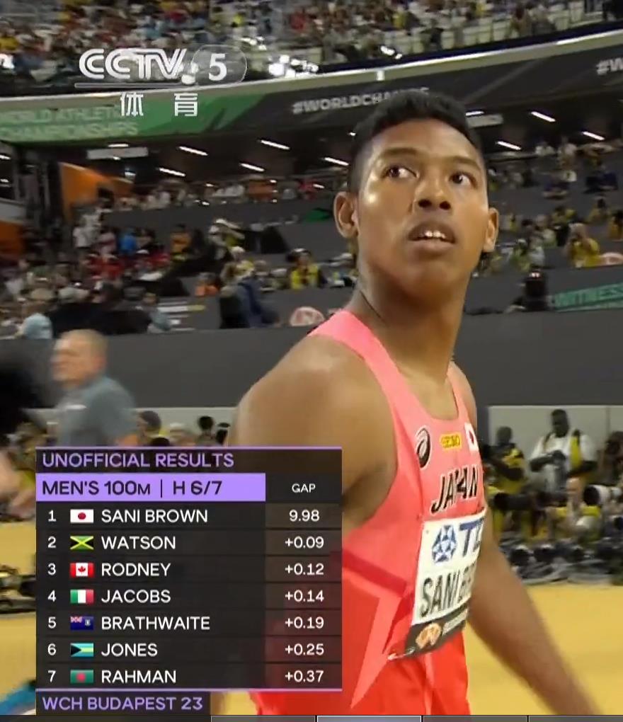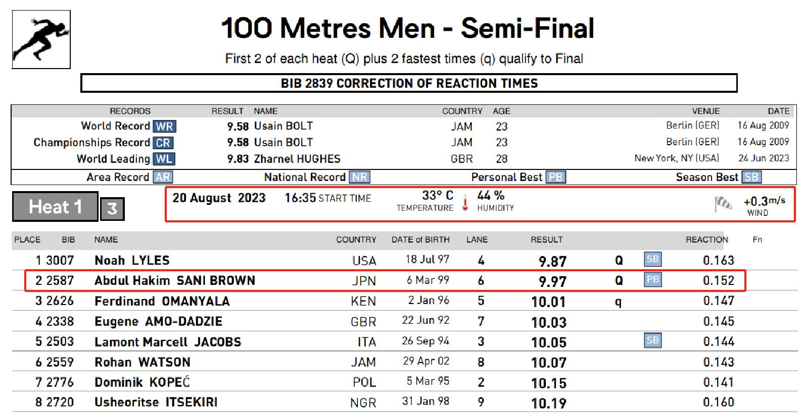 布达佩斯:2023年8月20日19:11 萨尼布朗10.04决赛第6 风速0.0 反应时0.177