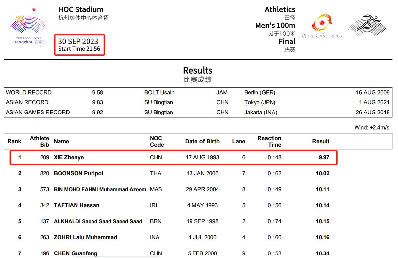 杭州亚运:2023年9月30日21:56 谢震业9.97决赛第1 风速+2.4 反应时0.148