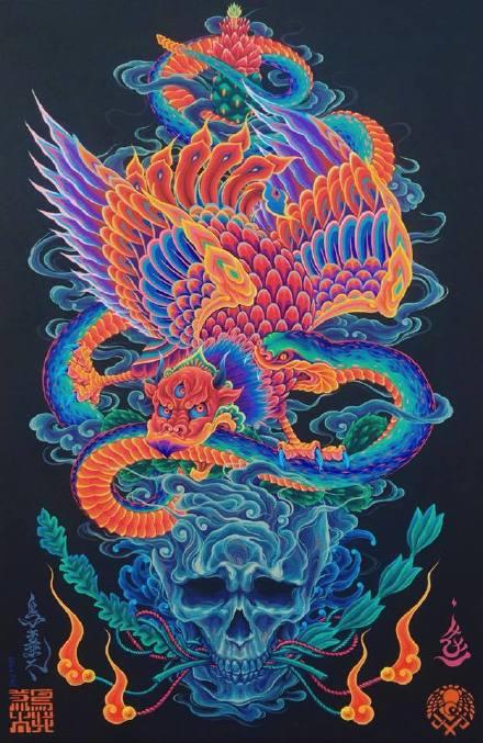 ◆日本艺术家鸟井荒木(Kenta Torii) 绘画了三海经神怪的浮世绘作品,绘画的作品充满了活力。像日本的浮世绘传统具有意象之美和现代艺术相结合融为一体的表达。插画艺术形成独有的艺术表现,Kenta Torii 以经济的绘画描绘着每一个细节,他设法正确的融合和代表着日本的文化艺术和日本的文化特色形成,具有西班牙的流行趋势文化,也具有墨西哥的流行文化,作者在中国也学习了许多艺术表达,将其艺术形式表达的作品当中。