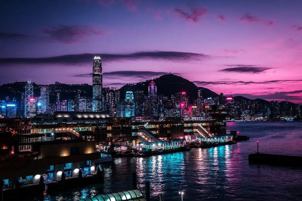 当夜幕低垂时,整个城市瞬间变成万家灯火的一刻,璀璨的灯光交相辉映着维港的海面与上空都泛起淡紫的光晕,壮丽绚烂的天际线,美得挪不开眼。