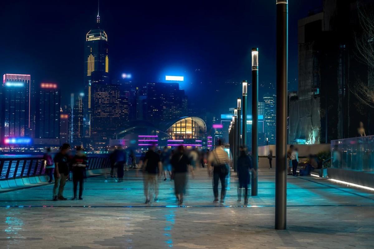 尖沙咀海滨长廊,视野开阔,沿海可以看到维多利亚港与香港岛的夜景。