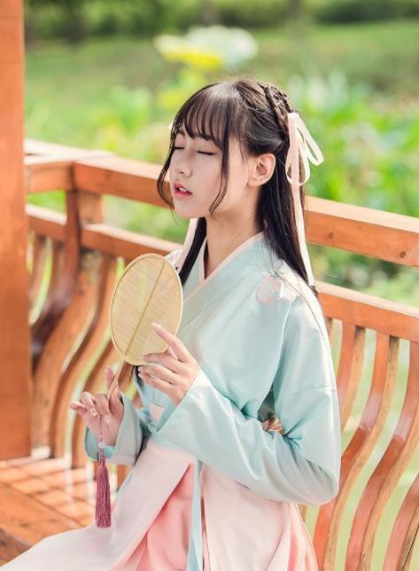 双子的专属汉服是比较普遍的,上身以蓝色打底,点缀则是用粉红色的樱花,下身则是粉色的百褶裙,给人一种小桥流水人家的感觉。