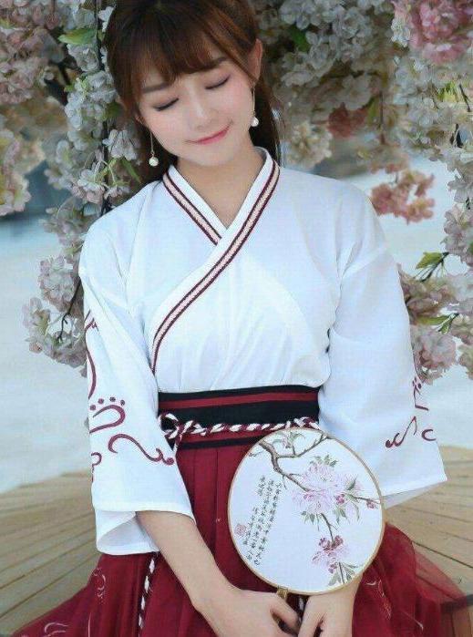 双鱼座的专属汉服上身以白色为主,两袖宽敞,边上绣着一些图案,领口是红白两色,下身以红色为主,腰带则为黑色,给人一种静雅的感觉。