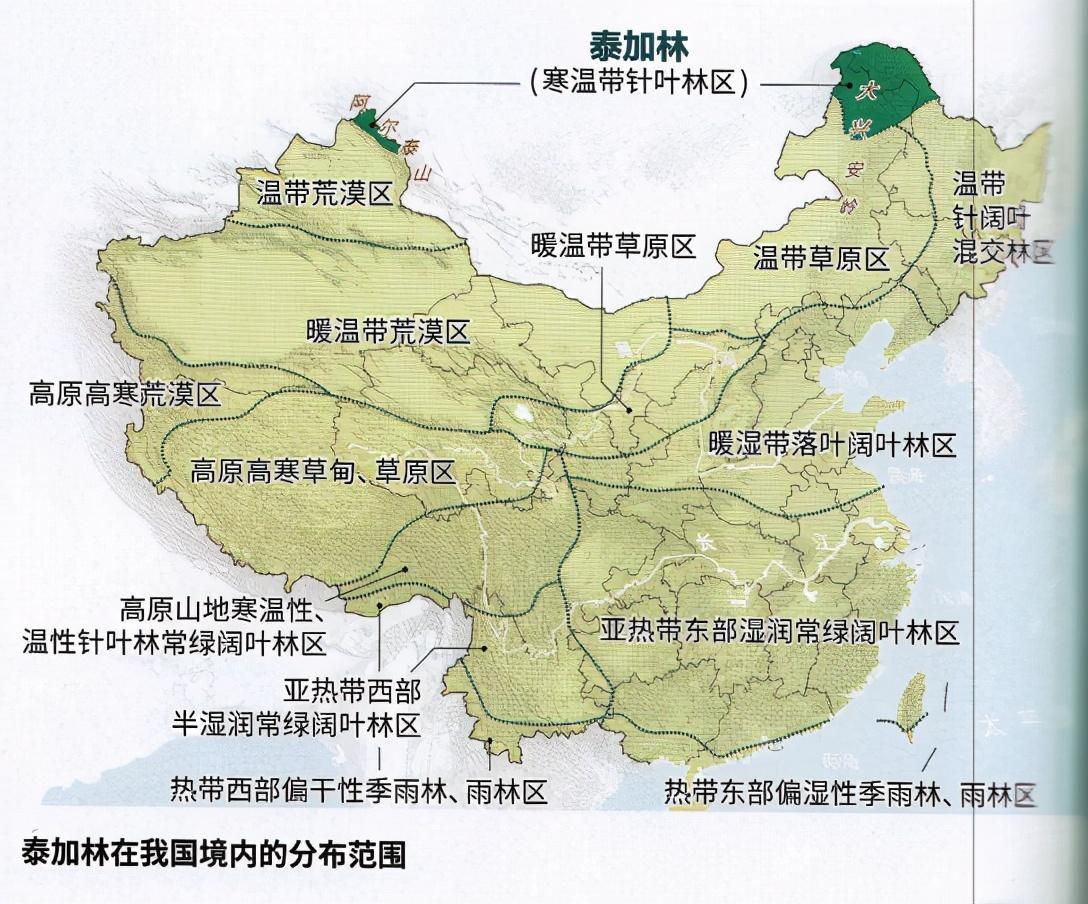 综合自然区划图与植被区划图所展现的内容侧重点有所不同,但都明确标出了我国泰加林的分布区域。不同的区划地图把泰加林范围标示为“寒温带针叶林区”或者“寒温带明亮针叶林地带”。
