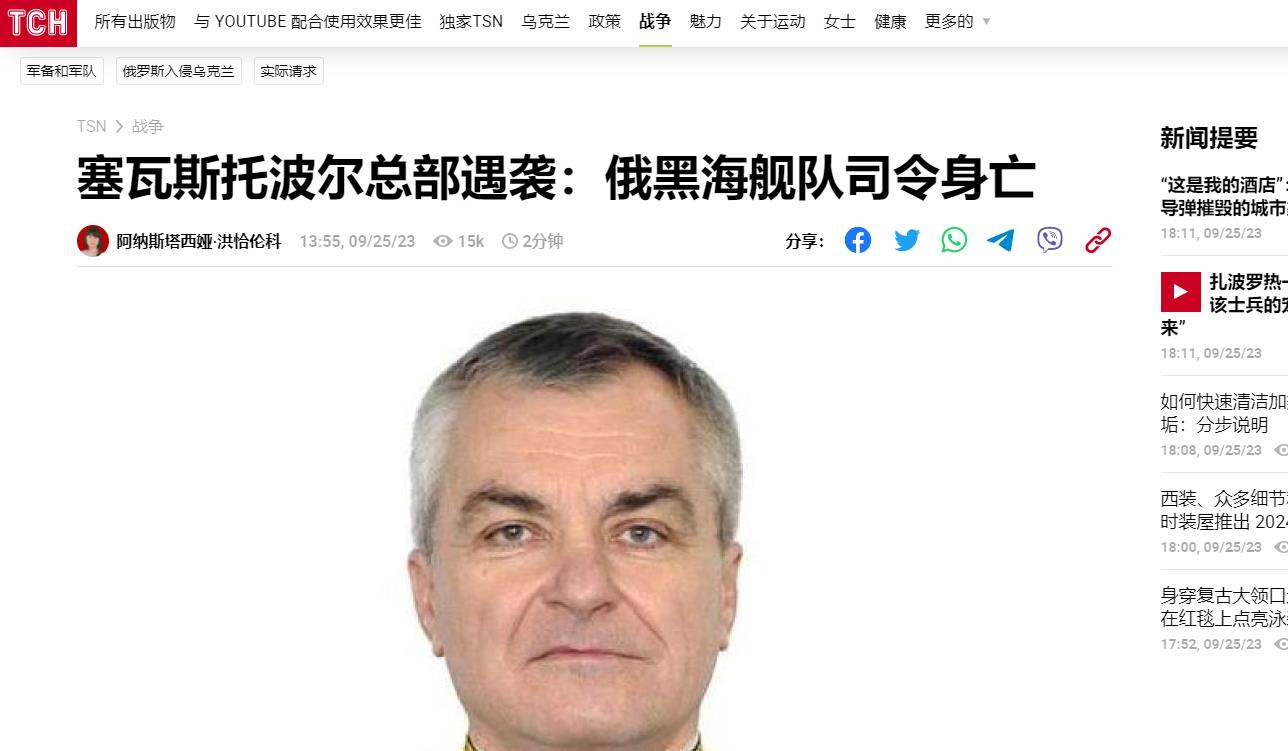 乌克兰tsn新闻网、《乌克兰真理报》、乌克兰《电讯报》9月25日报道,乌克兰特种作战部队9月25日宣布:俄罗斯黑海舰队塞瓦斯托波尔总部遭到乌克兰的导弹袭击,共有34名俄罗斯军官被杀,包括俄罗斯黑海舰队司令索科洛夫海军上将!