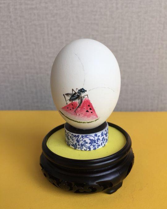 三、黑色尽量要用颜料,不要用墨,因为墨在蛋壳表层渗入性强,不便修改。