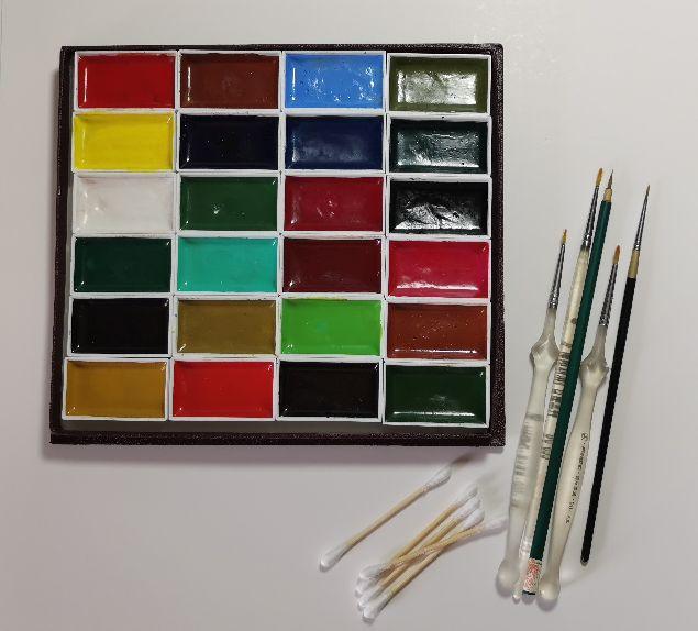 250目金相砂纸、锥子、镊子、竹丝、剪刀、美工刀、彩色软面纸、双面胶带、装饰胶带、玻璃罩、磁圈、705透明胶、棉签、0—5号描笔、国画颜料。