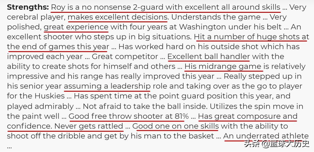 你可以看出来,这份选秀报告给了罗伊相当高的评价,尤其是在球商、关键球、中距离、领袖气质和单打上,因此哪怕他读完大学四年依然在第六顺位被选中,不过当时也认为罗伊没有突出的地方,而且他的臂展不出色,力量不算强,防守也一般。