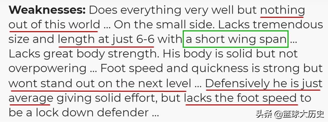 而在劣势上,对罗伊是这么形容的:他的每一个方面都很好,但是没有一项技能达到了顶级;细节上,他身材并不好,臂展只有6尺6(约为1米98,和罗伊身高一样);缺少身体力量,他的身体很结实,但不突出;速度很快,但在NBA还不算突出;防守端,罗伊已经很努力了,但还是中等水平,防守脚步不够快,不能锁死对手。