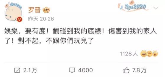 罗晋直接发文声明,“娱乐也要有度,触碰底线伤害家人,那对不起,我不玩了”,隔天就将所有和《天下长河》有关的微博删除,不得不说不惜得罪片方也要维护妻子唐嫣的罗晋简直太帅了。
