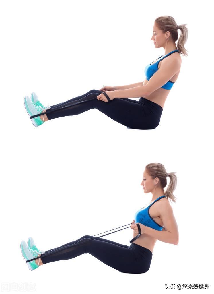 将拉力带往腹部方向拉动,可以锻炼到背阔肌,如果身体再继续后挺,还能刺激竖脊肌。