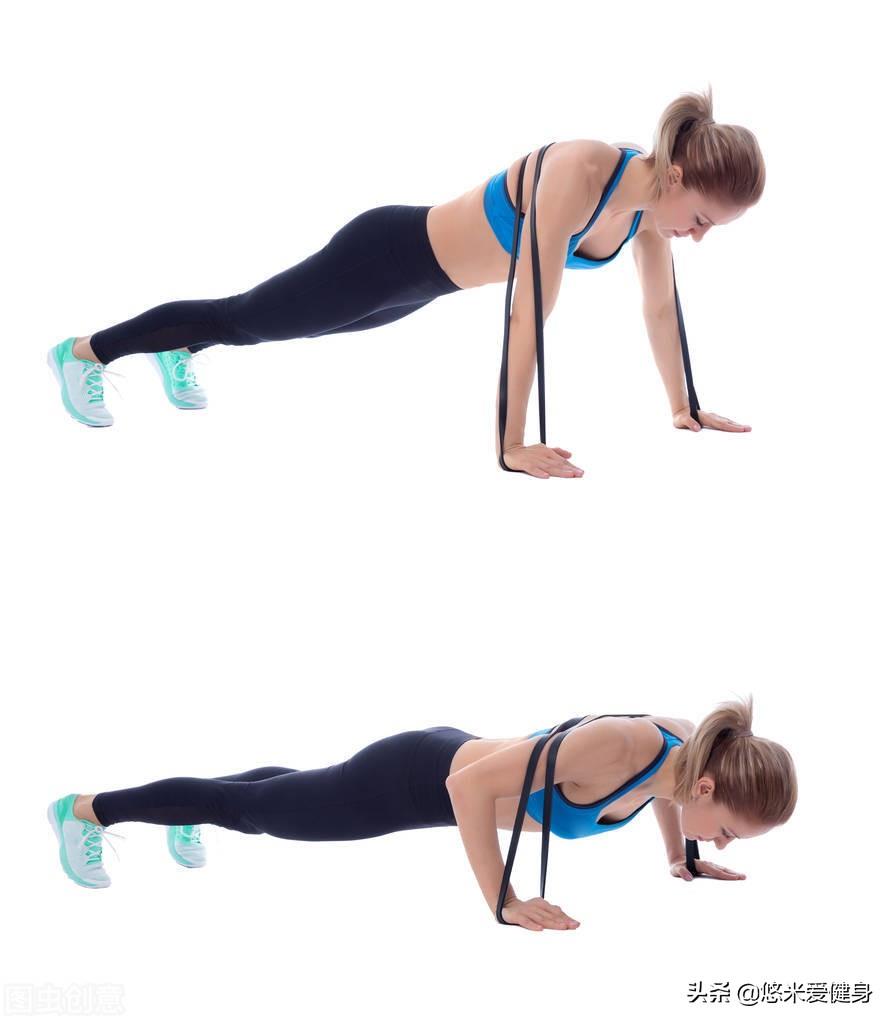 注意:使用拉力带做俯卧撑,相当于在增加负重训练,能够进一步增强胸肌、手臂和肩部的刺激效果。