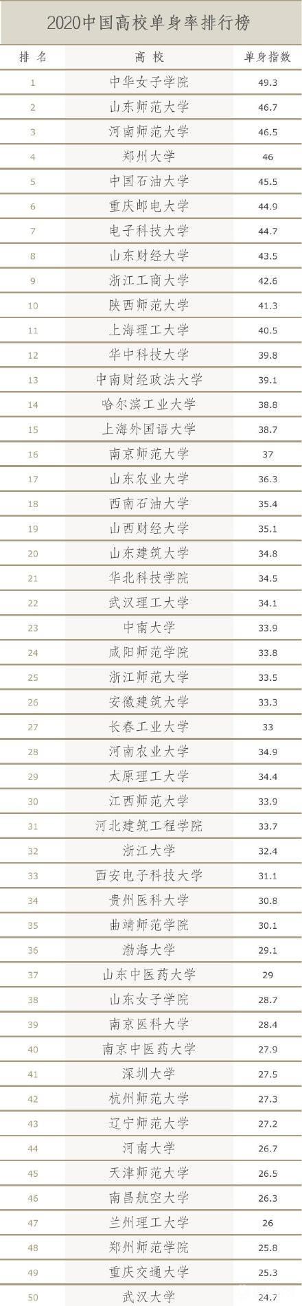 近日,一份2020年中国高校单身率排行榜出炉,引起不少网友的关注。其中,被称为“女儿国”的中华女子学院高居榜首,其次是山东师范大学和河南师范大学,要知道这三所大学女生比例超高,不禁让人感叹:大学生女光棍真多啊!值得注意的是河南最牛大学,郑州大学在这份榜单中排名第四。