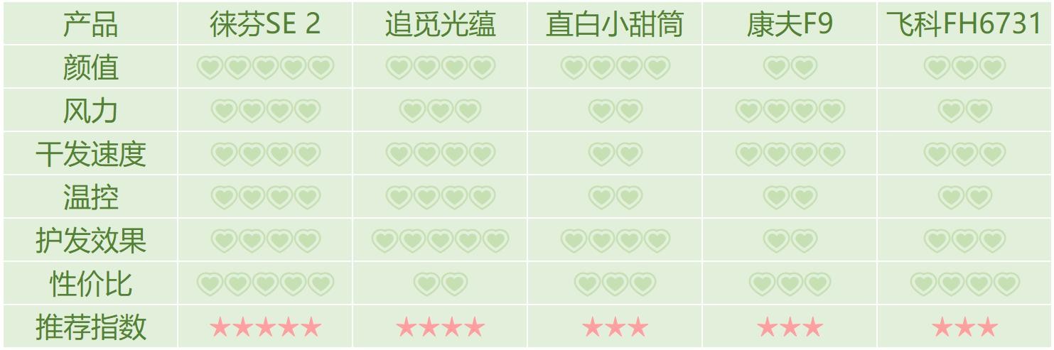 五款吹风机测评结果如下: