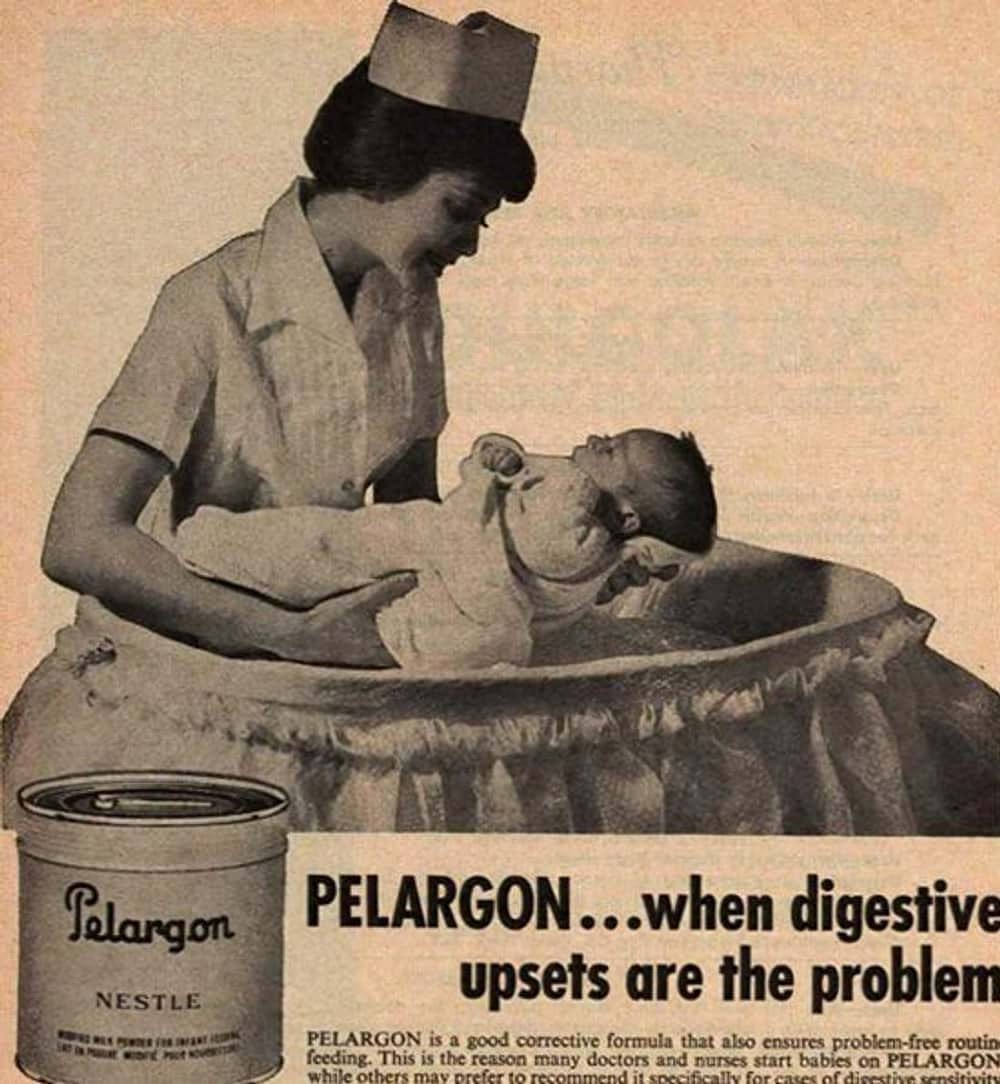 二战后,许多西方家庭从母乳喂养转向了奶瓶喂养。后者被认为更文明、更现代、更整洁。选择奶瓶喂养的母亲表面上得到了科学的支持;雀巢公司(其创始人、药剂师亨利·雀巢于1867年发明了婴儿配方奶粉)等公司生产的配方奶粉富含营养,是母乳的绝佳替代品。