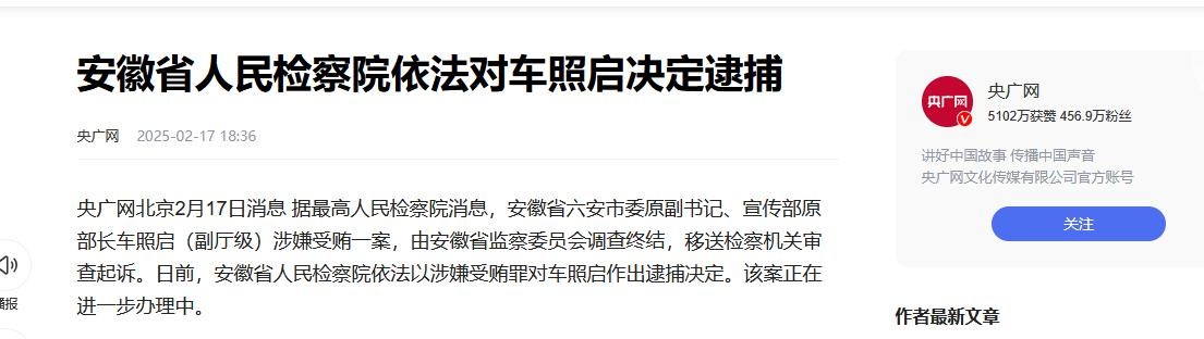 参考资料:安徽省人民检察院依法对车照启决定逮捕