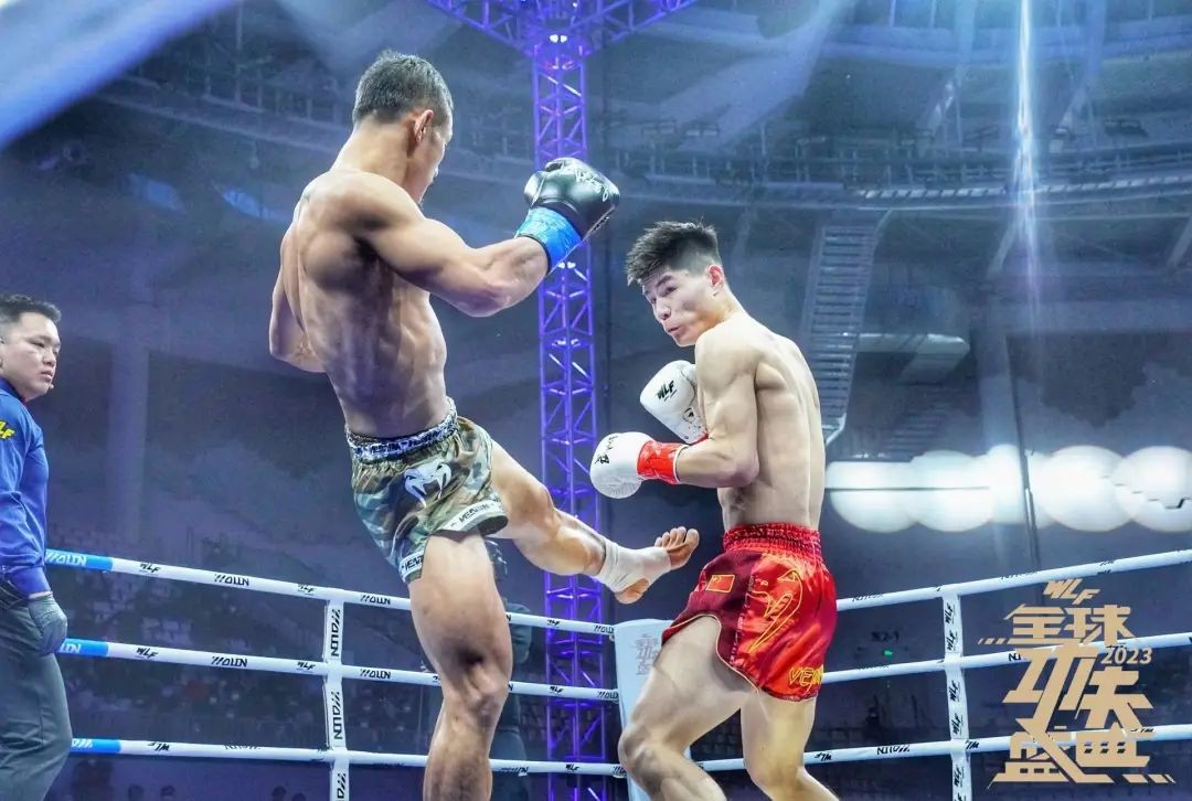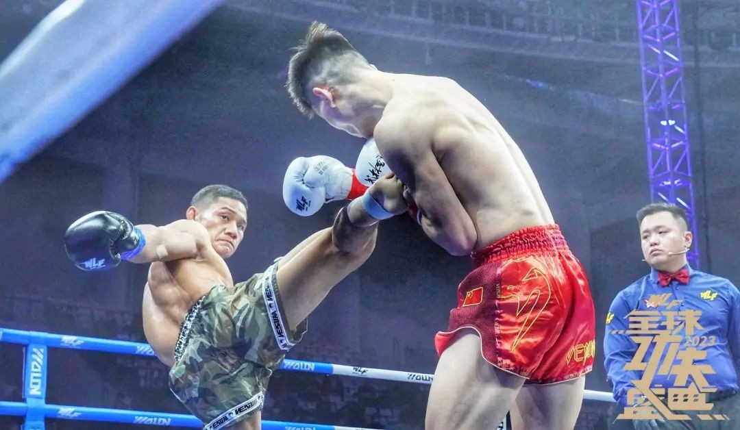 “牛皮糖”刘志鹏率先出战,他的对手苏赛特,是2019年泰国电视7台最佳选手。经历第一回合相持之后,刘志鹏迎来爆发时刻,在第二回合分别重拳重腿打倒苏赛特,两次读秒扣分;第三回合,刘志鹏再次抓住机会,抡拳命中,摇摇欲坠的苏赛特坚持到了最后,然而大势已去。值得注意的是,刘志鹏多次冷高扫突破了泰国人的防御。