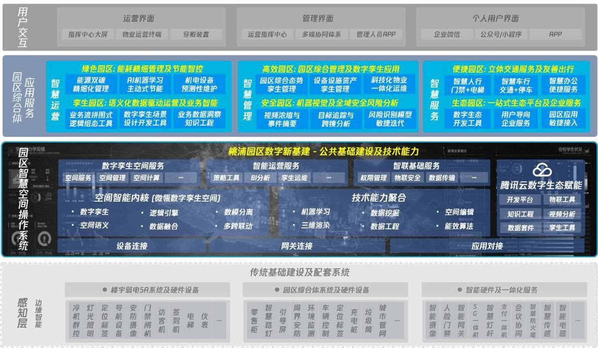 3.、应用层基于平台层中构建的园区数字化公共基础建设与技术能力,打造面向智慧运营的能耗精细管理及节能智控、语义化数据驱动运营及业务智能;面向智慧管理的园区综合管理及数字孪生应用、机器视觉及全域安全风险分析;面向智慧服务的立体交通服务及友善出行、一站式生态平台及企业服务。实现高效园区一专多能管理、安全园区全域立体安防、便捷园区灵动空间服务、绿色园区模型驱动节能、孪生园区语义重塑资产等园区智慧化建设成果。