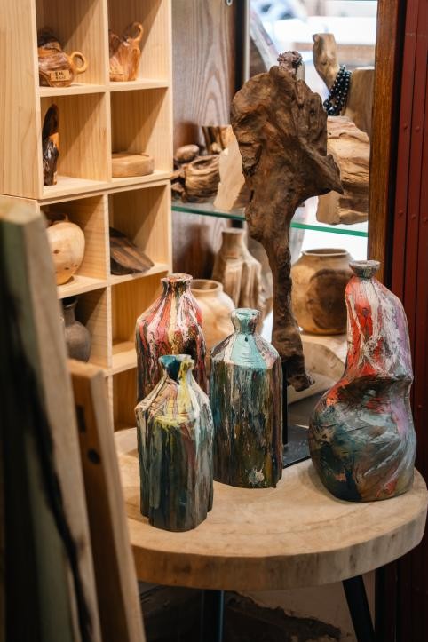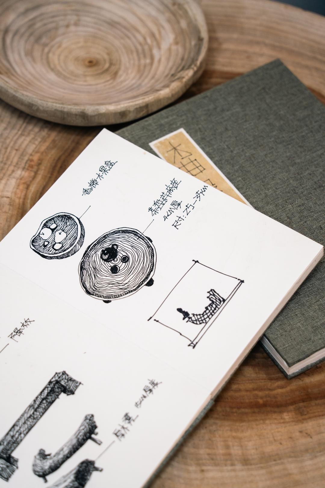 店里的工艺品密密麻麻摆了很多,从摆件到器具都是原创,手绘的设计图就摆在店里可以随意翻阅。店里没有手工体验,但接私人订制。
