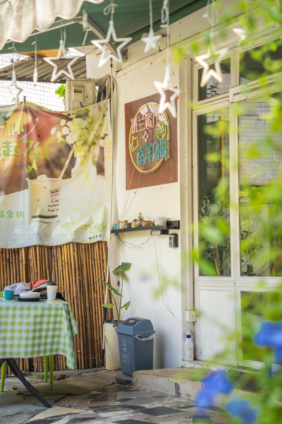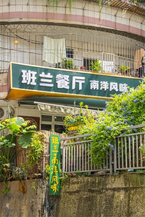 从咖啡店出来直行几百米,再走过陡峭但艺术的涂鸦楼梯,就来到了班兰餐厅。庭院式餐厅,装修风格有种古早的东南亚风情,很文艺。