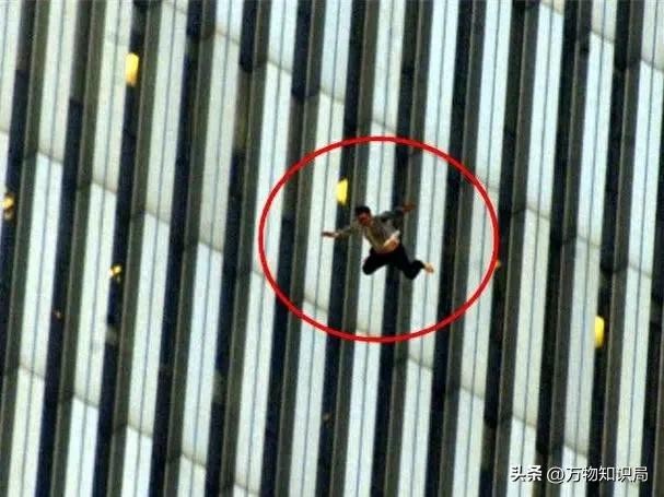 双子塔倾倒的瞬间,或许此时机组上的人员已经死亡,大楼的坍塌和爆炸,也造成了不少人员的死伤,因为火势太大加上浓烟,许多人都被困在双子塔里,其中有不少绝望的人,选择从窗户一跃而下,在抓拍到的镜头中,他们只是小小的一个影子。