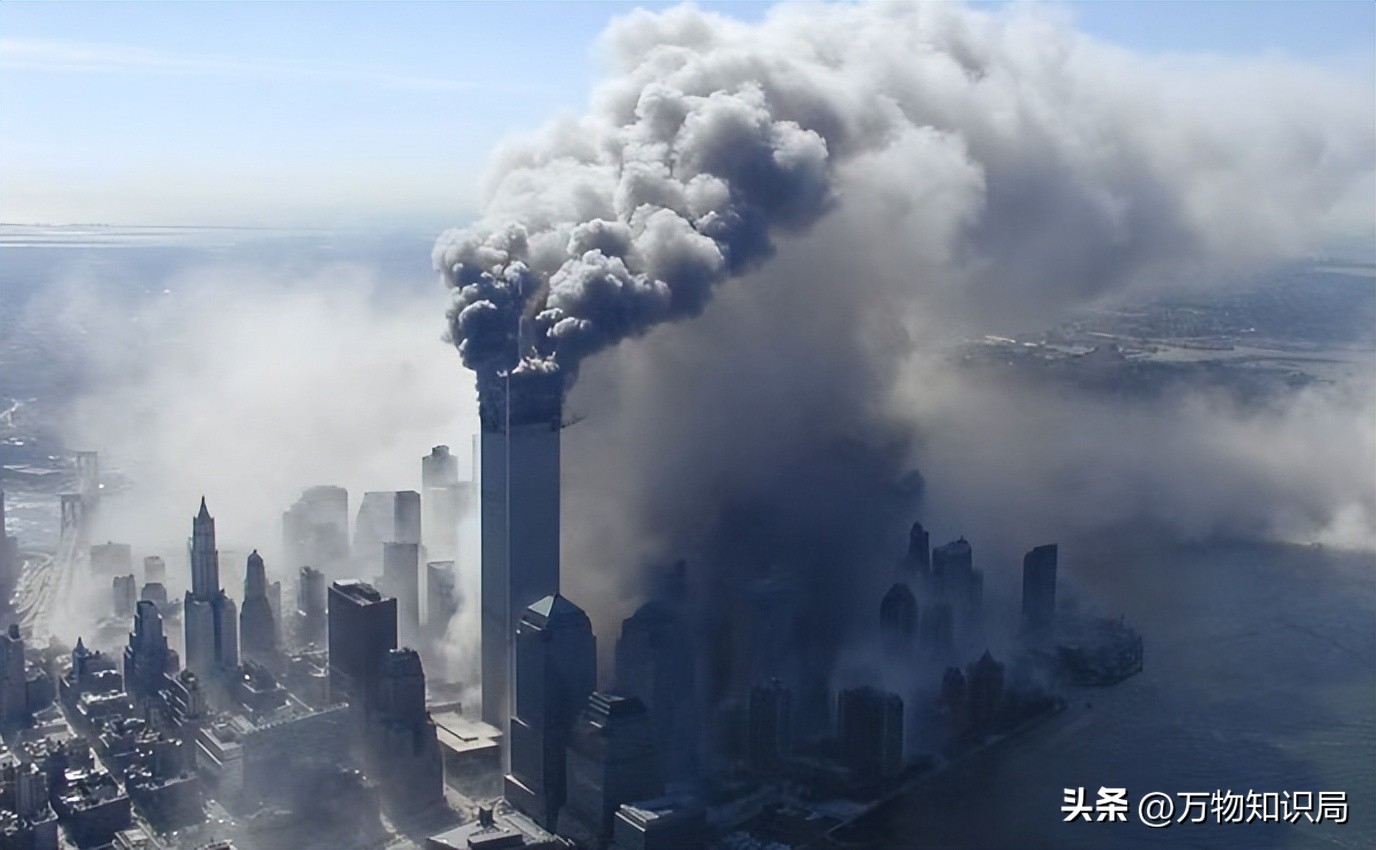 照片中就是发生袭击以后由高处拍摄到的画面,可以看到当飞机撞向双子塔之后,虽然主体还没有坍塌,但是浓烟已经产生,并且因为撞击导致飞机燃油外泄,随即而来的就是巨大的爆炸,从而也导致了曾经美国最繁华的世贸中心一号楼坍塌。