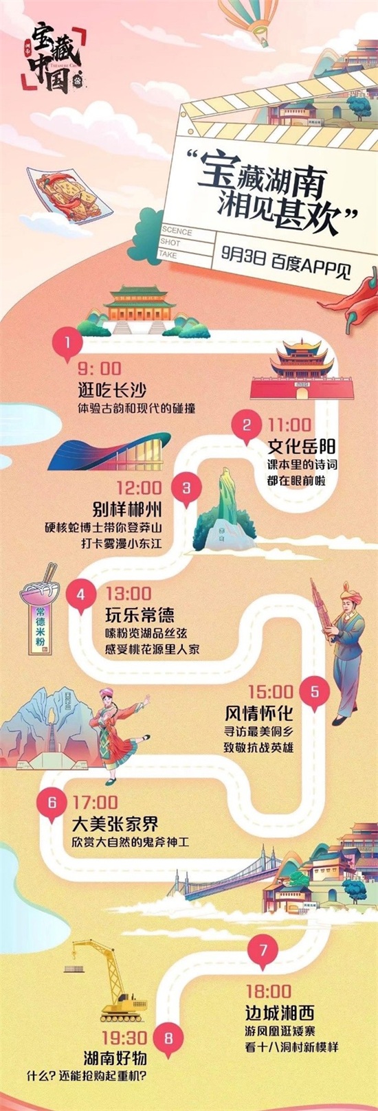 9月3日,由湖南省委网信办指导,百度主办的“宝藏湖南”大型公益直播活动在长沙举办,旨在通过网络公益直播带货带客,创建网络公益直播新模式,巩固脱贫成果,助力乡村旅游振兴。