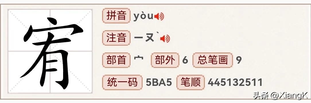 读音为“yòu”,同音字“佑”,部首为“宀”,总笔画9,上下结构。