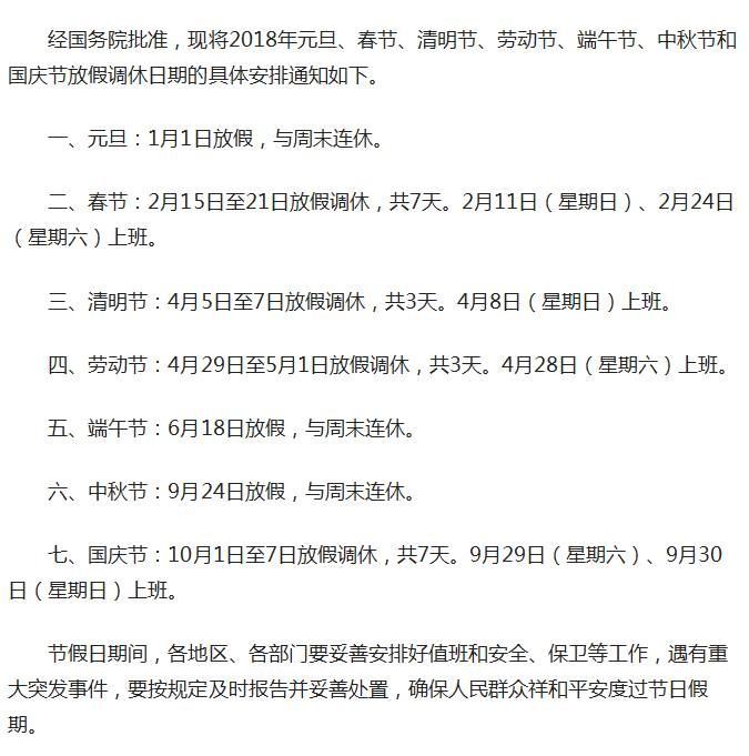 国务院办公厅11月30日发布《关于2018年部分节假日安排的通知》,内容如下: