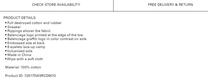 在巴黎世家美国版官网,这款鞋名为限量版完全摧毁PARIS高帮运动鞋,介绍中明确标注,“全毁掉的棉布和橡胶”,“布料撕裂”等字样。据其官网标注,这款运动鞋系在中国制造。