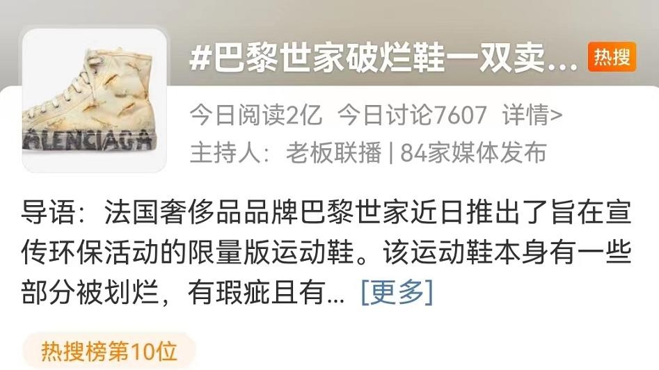 巴黎世家1.2万元“破烂鞋”上热搜,比新鞋贵一倍多!网友:垃圾桶里都难找