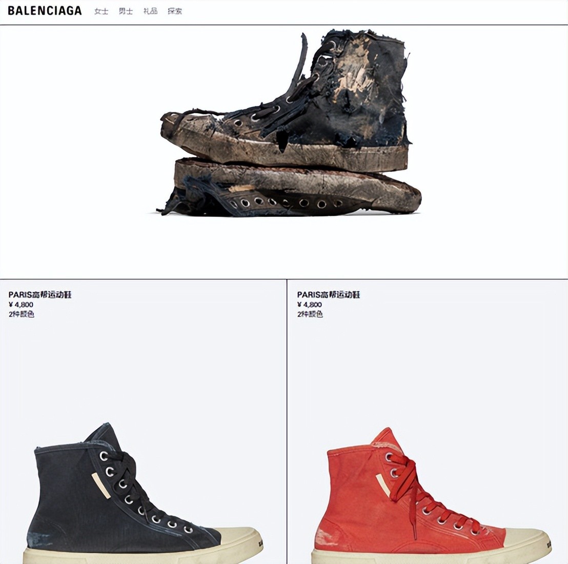 目前,在巴黎世家中国官网,限量版完全摧毁PARIS高帮运动鞋仅有宣传图片,并无购买入口。而仅显示为PARIS高帮运动鞋的产品售价在4800元。
