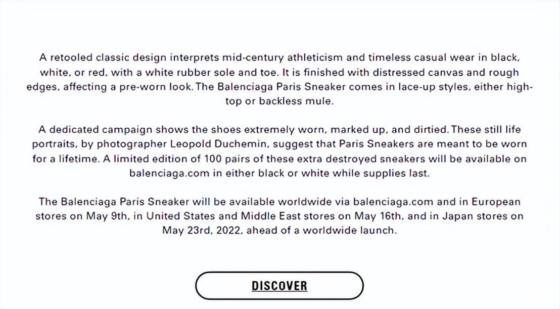 据介绍,“巴黎世家PARIS运动鞋将于2022年5月9日在全球通过balenciaga.com和欧洲门店销售,5月16日在美国和中东门店销售,5月23日在日本门店销售,之后将在全球发售。”