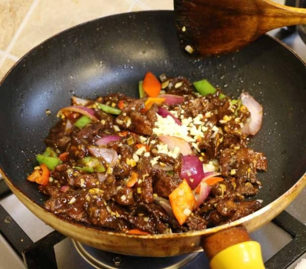 第四步,把洋葱扒皮洗净,切成两半,我们用一半,切成小块,青椒洗净,取四分之一,切成小块,红椒也是洗干净,留四分之一,切成小块,起锅放油,油温七成热时,把洋葱放进去,煸炒出香味,再把红椒块和青椒块一起倒入锅中,炒至断生。