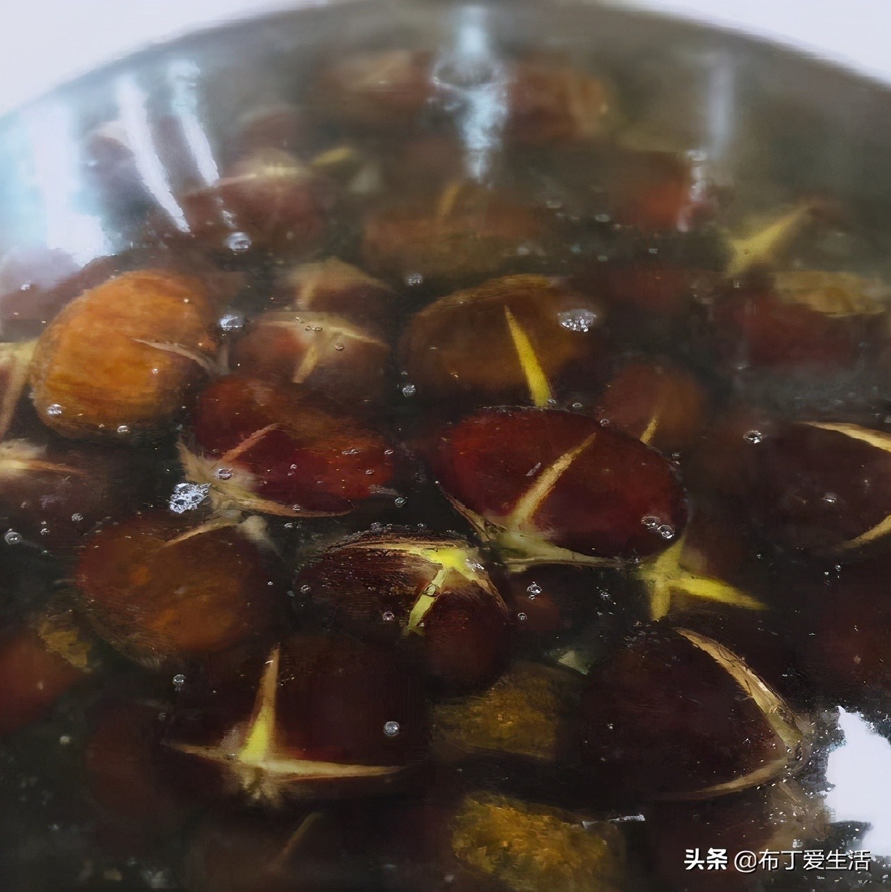 2、起锅,加足量清水,加1勺食盐。水烧开后,将划好的板栗倒入,煮1分钟。关火,浸泡6-8分钟,将板栗壳自然泡软。壳子吸水后会发胀,形成自然"开花"的状态。趁热剥去外壳和内皮, 2秒1个,而且剥得非常的干净。