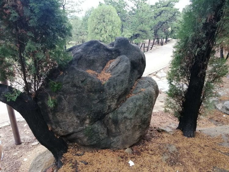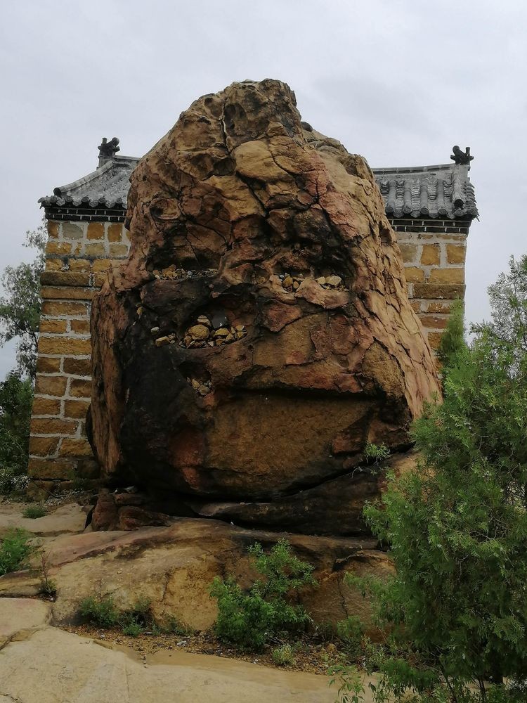 漫步于崮顶,尽揽以巨石组成的崮顶和那石缝里长出的草木。盘踞在崮巅的奇石、盆石、探海石、平台石等,其形惟妙惟肖。庙屋后面的奇石,石高3丈,奇形怪状,坑坑洼洼,布满黑色、红褐斑纹,似炉渣,疑雷击烧烤之痕,又像云石,传说流星残骸落于此。据说,唐末黄巢起义军在大王庄镇一带驻扎操练,曾在永宁崮顶这块岩石刻过“王仙芝古住”的行楷字样。我在此石周边仔细观察,也没找到此字的刻迹。崮顶石缝里长出的那松柏等树木,或挺拔,或横卧,或老干虬枝,那古藤野花,随风招摇。南天门门前平台下面岩缝里长出的一棵古黄连树,有千年树龄,据说与东邻大舟院寺庙旁的那棵黄连树同年栽植。崮顶北侧石光梁边石缝里长出的一棵卧柏,斜躺在地面之上,树身上长出的多根树枝如新生的小树,人们将其称为“老柏树上新生小柏树”。踏着崮顶坚固的土石,看着岩缝里长出的顽强的草木,不由对大自然的造化产生敬畏。