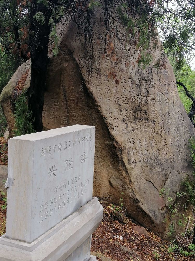 爬永宁崮山至崮顶,仅有两条登山路线,一条是山阳面的东路,一条是山西面的西路。从山阳上山,见松柏树林前建有红门庙,庙内供奉着泰山奶奶,即碧霞元君。从庙东侧北折上行,约行200米处,路侧有市文物部门2004年立的“兴隆碑”文物保护牌,牌上无“兴隆碑”介绍,此保护牌旁有一块3米多高的椭圆状的大石头,石头上密密麻麻的刻字,看来这块大石头就是“兴隆碑”,碑上的文字大都是记载护山修庙者的人名。从兴隆碑北行山林间石台阶,大约上行300级台阶处西折,再行30级台阶后北折,然后走上1米多见方的平台,此处平台左右两侧垒有半人高的石墙,这里便是“中天门”,看墙垛口痕迹估计原来可能垒有石门。从“中天门”沿石台阶继续攀爬,左转右拐,攀上“南天门”前的石光梁平台。从平台上18级台阶进门洞,便见崮顶30多平方米的庙院,庙位于崮顶西北侧,是二层坚固的石头房屋,下层为元君庙,上层为玉皇阁。