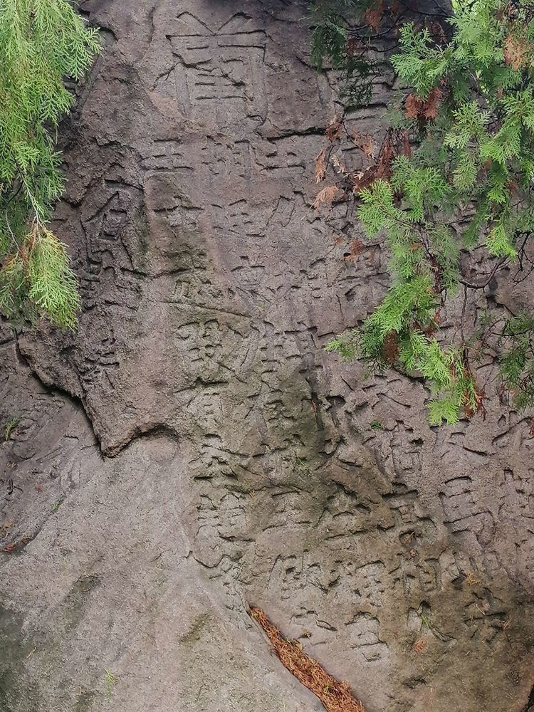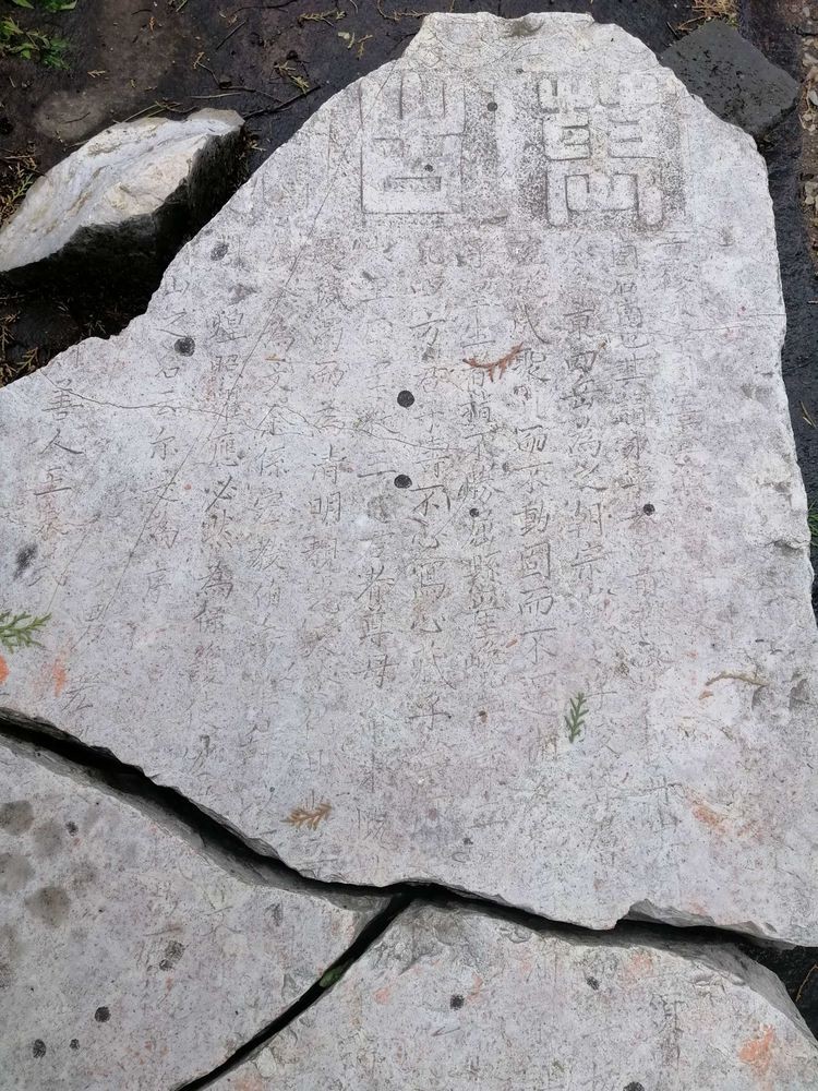 从崮顶下山,庙后西下40级石台阶至光滑平整的平台石,再下行30级石台阶,便是石垒的“西天门”。出门下50级陡台阶后穿越树林中相对平缓的260级石台阶,便返回到永宁崮山下。我在山下台阶旁的树荫下坐下稍息,在此翻看文友全宝著《乡愁飞歌》中有关永宁崮的文章,又看庆军提供给的《为善最乐》碑文拓片中记载的修缮永宁崮庙观的记载,回想一下永宁崮这座神山、文化山令人难忘的景色元素。
