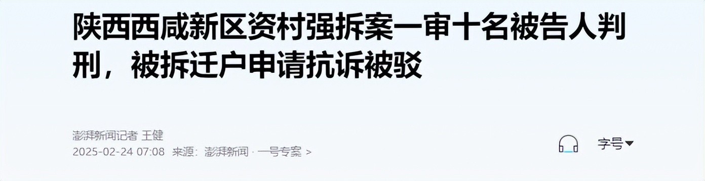 信息来源:“澎湃新闻官方账号”——(#陕西西咸新区资村强拆案一审十名被告人判刑,被拆迁户申请抗诉被驳)