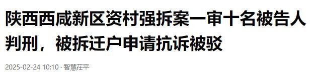 信息来源:“聊城市茌平区融媒体中心(聊城市茌平区广播电视台)官方账号”——(陕西西咸新区资村强拆案一审十名被告人判刑,被拆迁户申请抗诉被驳)
