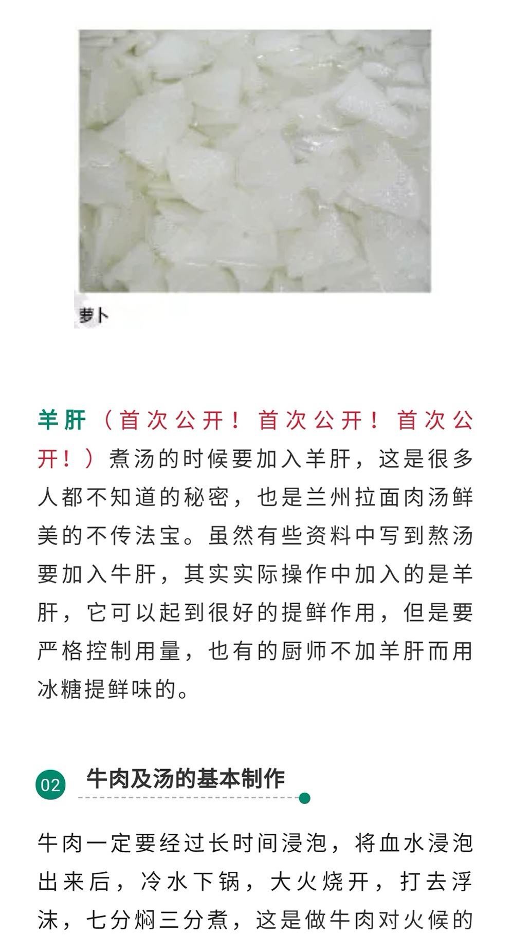 还有一个非常关键的点就是,兰州拉面的汤除了要加萝卜,还要加羊肝提鲜,这个很多技术里面都是省略的,大家会不自觉的把自己的技术漏掉一点点,让你感觉到味道就是差了一点!
