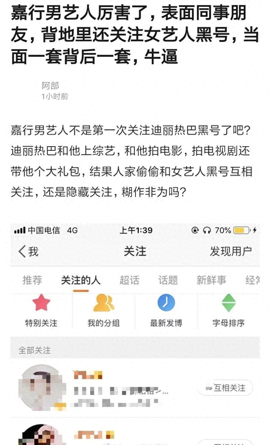 作为嘉行的旗下艺人,网曝张云龙和迪丽热巴的黑号互关,而且还是隐藏关注,换个角度想想,如果是自己关注同事的黑号,而且还是悄悄的互关,这个怎么解释?