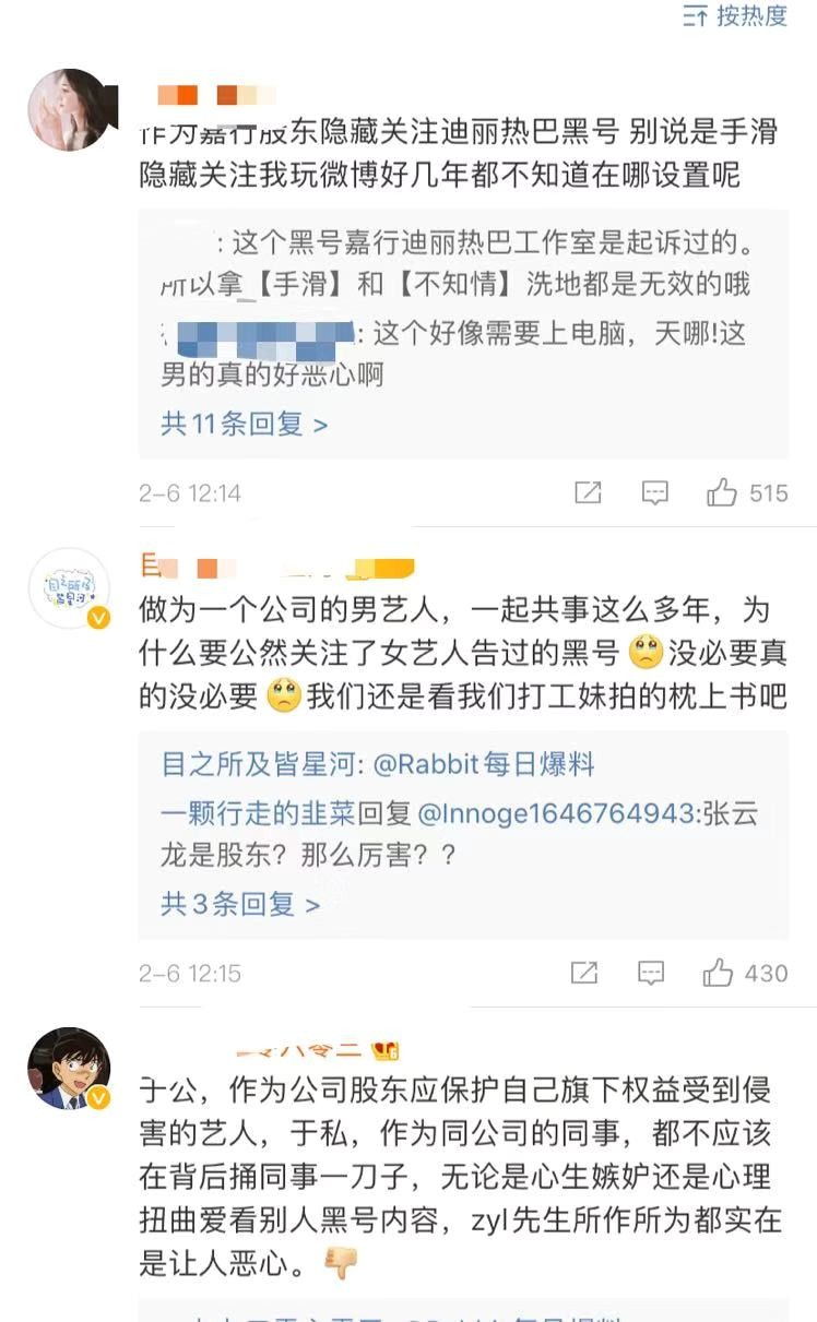 网友都不理解,为什么张云龙会关注迪丽热巴的黑号,这个真的很难解释,即使手滑也说不过去,为什么会隐藏互关?不过又没有曝光张云龙有不利于迪丽热巴的言论或爆料,只是关注黑号也没理由,看来这个只有当事人才清楚,迪丽热巴发展的确比其他男艺人好,再说嘉行的男艺人都很低调,只有女艺人话题不断,感觉也是有点阴盛阳衰,不会因为艺人的规划发展不一起矛盾吧?
