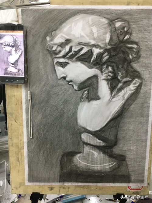 在画布上构图时,要注意画面的平衡和空间感。根据石膏像的大小和形态,合理安排其在画布上的位置,并确定光源方向,以便更好地表现光影关系。