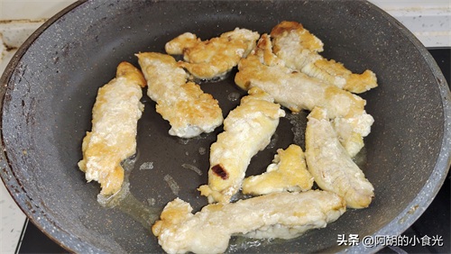 第四步:锅里烧油,把腌制好的鱼籽下入油锅中煎炸一会,煎至其四面金黄,香味扑鼻时用铲子将其切成小块,而后关火盛出备用。