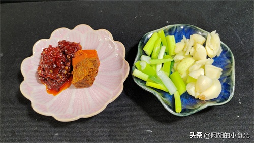 第三步:辅料方面需要准备郫县豆瓣酱和火锅底料一小块,再切一些葱姜蒜备用即可。