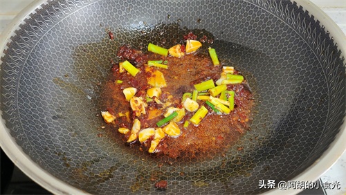 第五步:另起锅烧油,小火油热后下入豆瓣酱和火锅底料炒出红油和香味,而后加入葱姜蒜和一圈生抽炝出香味,再加入开水足量,淋入少许老抽来调整颜色。