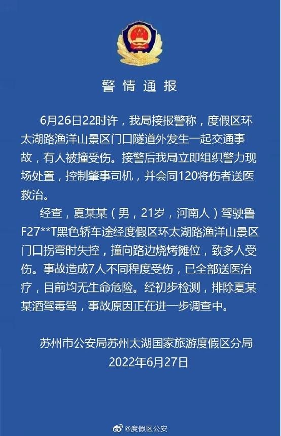 6月27日,苏州市公安局苏州太湖国家旅游度假区分局发布警情通报称,6月26日22时许,度假区环太湖路渔洋山景区门JP门隧道外发生一起交通事故,肇事司机拐弯时失控,撞向路边烧烤摊位事故造成7人不同程度受伤,已全部送医治疗,目前均无生命危险。经初步检测,排除肇事司机酒驾毒驾,事故原因正在进一步调查中。