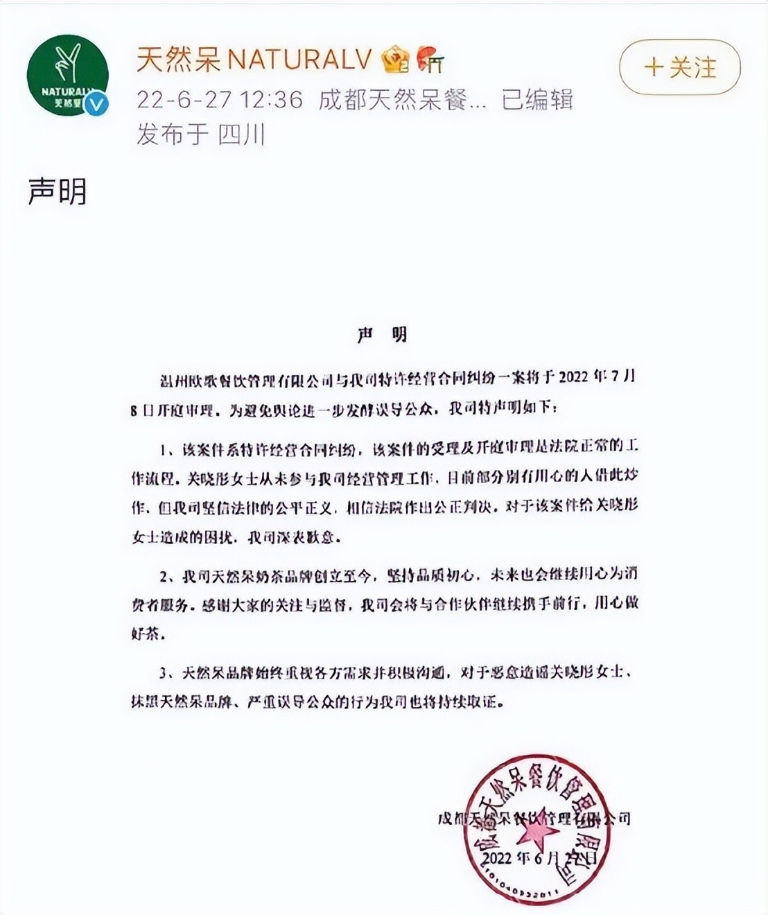 近日,网曝艺人关晓彤因天然呆奶茶店非法开放加盟被加盟商告上法庭,引发热议。6月27日,奶茶店公司微博发布声明称关晓彤从未参与公司经营管理工作,给关晓彤造成困扰深表歉意。对于恶意造谣关晓彤、抹黑品牌、严重误导公众的行为公司将持续取证。