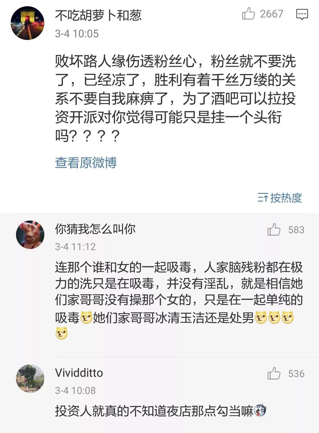 自从胜利经营的夜店被爆出丑闻之后,该事件一直备受胜利的中韩粉丝以及网友的关注,对于胜利到底有没有做出什么触犯底线的事情,大家都十分好奇。许多粉丝甚至认为这是有人在恶意陷害自家偶像,要将胜利彻底击垮。emmm,粉丝们维护爱豆的心可以理解,但是这瓜一波又一波,证据也是一个接一个,在这么多事实面前,胜利作为投资人定有无可推卸的责任,粉丝们也别再过度洗白自家偶像,以免招路人反感。
